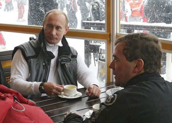 1月3日,在俄罗斯南部度假胜地索契的波利亚纳滑雪场,俄总统梅德韦杰夫和总理普京一起喝茶。饮茶后,梅德韦杰夫起身结账,普京紧跟在后,毫无掏钱意向。普京表示:“无论买什么东西都是总统付钱。” 梅德韦杰夫则“大方”回应:“付账是我的工作。”