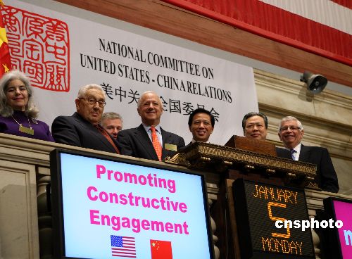 美国纽约证券交易所5日举行纪念仪式庆祝中美建交30周年,美中关系全国委员会会长欧伦斯(左四)敲响开市钟,中国常驻联合国代表张业遂(右三)、中国驻纽约总领事馆总领事彭克玉(右二)、美国前国务卿基辛格(左二)、美国NBA总裁斯特恩(右一)、纽交所执行总裁尼德奥尔(左三)、美中关系全国委员会副会长白莉娟(左一)等出席仪式。中新社发 李静 摄