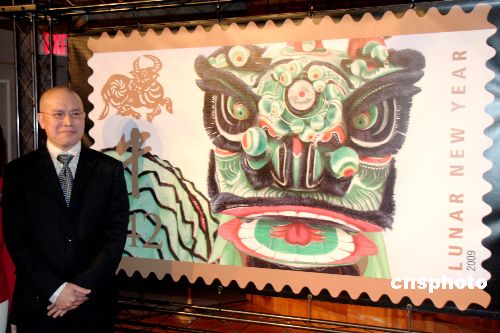 美国邮政总局8日正式发行“牛年”邮票,以庆祝世界约四分之一人口正期盼的农历新年“牛年”到来。图为邮票设计者、现居纽约的华裔邮票艺术家麦锦鸿(Kam Mak)和“牛年”邮票。中新社发 魏晞 摄