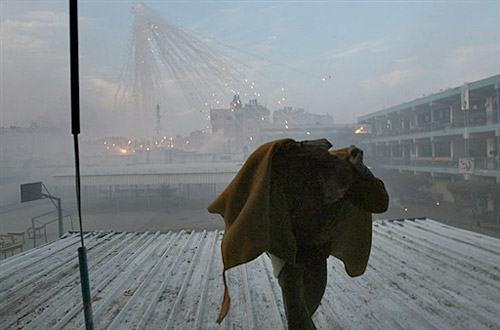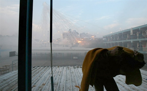 以军1月17日再次袭击加沙北部一所联合国学校,一名妇女和一名儿童丧生,以军坦克和巴勒斯坦武装分子在学校附近激烈交火。图为一名巴勒斯坦人在战火中逃生。