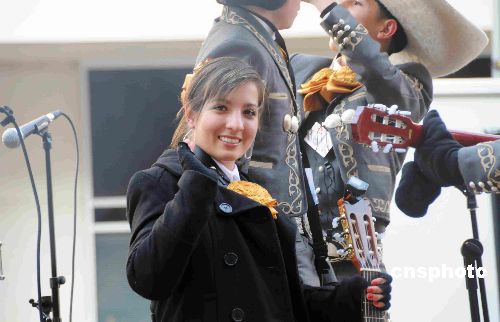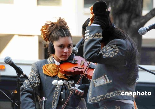 美国东部时间1月20日中午11点30分,美国第44任总统奥巴马在国会山前宣誓就职。下午,官方组织的一场游行在著名的华盛顿宾夕法尼亚大街举行。图为奥巴马就职日游行队伍中的拉提琴的美少女。中新社发 邱江波 摄