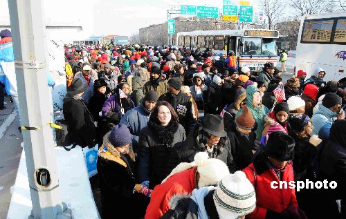 美国东部时间1月20日中午11点30分,美国第44任总统巴拉克·奥巴马在国会山前宣誓就职。来自全美各地和世界各国的观礼群众200多万人聚集华盛顿国家大草地观看了这一盛大的就职典礼。由于官方禁止一切非官方车辆出入首都,百万民众在等待官方指定摆渡车时,现场如同置身中国春运。中新社发 邱江波 摄