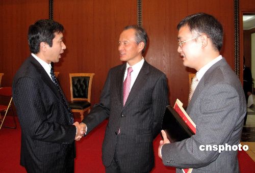 近日,中国驻日本大使崔天凯在东京举办2009旅日华侨华人新春招待会。会上,崔大使亲切会见了日本人汉语征文大赛主办者和赞助单位负责人,听取他们的汇报。图为崔大使会见大赛赞助单位社长。中新社发 段跃中 摄