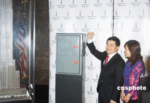 1月23日起,美国纽约著名的标志性建筑帝国大厦,将连续4天在大厦顶端点亮象征中国的一千三百二十七盏红黄两色彩灯,以庆祝中国农历新年的到来。图为中国驻纽约副总领事董晓军及夫人出席了当天的亮灯仪式,并共同拉下象征启动的电闸。中新社发 魏晞 摄