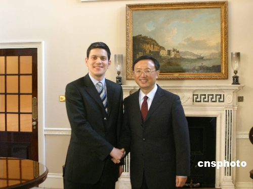 当地时间二月一日下午,陪同温家宝总理访英的中国外长杨洁篪在伦敦会晤英国外交大臣米利班德。中新社发 张朔 摄
