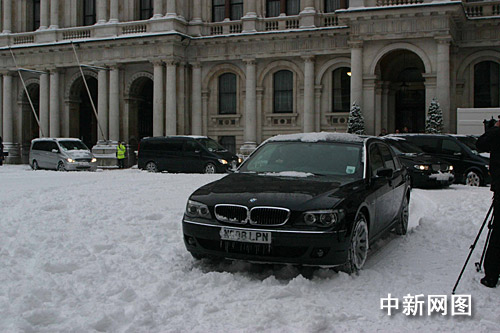 当地时间二月二日上午八时三十分许,中国总理温家宝在英国伦敦出席布朗首相举行的欢迎仪式。图为温家宝的座车驶入英国外交部内庭院欢迎仪式现场。前夜,伦敦突然迎来近十七年最大的一场降雪,整座城市被白雪覆盖。中新社记者 张朔 摄