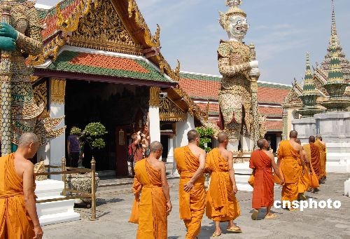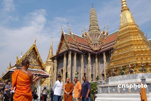 2月16日,多名和尚到泰国曼谷著名景点大皇宫参观,大皇宫和其内的玉佛寺——供奉泰国第一国宝玉佛的寺庙,每年都吸引着泰国全国和世界各地的佛教徒和游客。随着最近泰国政治社会逐渐稳定,来自世界各地的游客纷纷到泰国各著名景点旅游,泰国旅游业开始复苏。中新社发 刘万强 摄