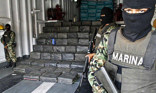 2月16日,在墨西哥的一处海军基地,士兵正在看守缴获的可卡因。15日,墨西哥海军在太平洋国际海域的一艘船上缴获近7吨可卡因,并扣押船上5名嫌疑人。