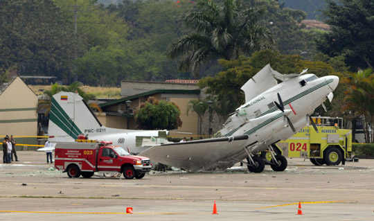 2月18日,哥伦比亚国家警察的一架DC-3飞机在麦德林的一个机场发生爆炸,造成至少8名警察受伤。图为爆炸的飞机残骸瘫在停机坪上。