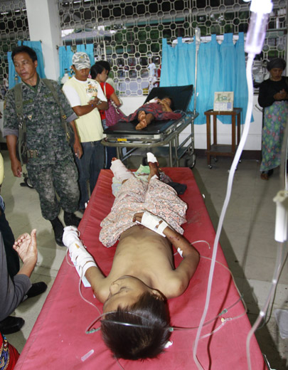 3月3日,在菲律宾南部哥打巴托附近的小镇布尔顿,一枚来历不明的迫击炮弹被一群儿童挖出后发生爆炸,造成3名儿童死亡,5人受伤。图为一名被炸伤的儿童接受治疗。