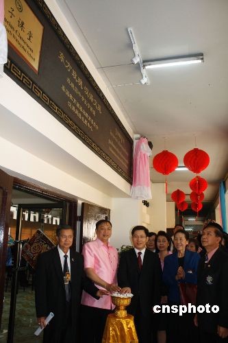 三月十七日,位于曼谷唐人街附近、具有一百二十七年悠久历史的泰国曼谷玫瑰园中学古老校园里,洋溢着浓郁的中国文化气息。上午九时,校园里热闹的锣鼓,精彩的舞狮拉开了“玫瑰园中学孔子课堂揭牌仪式”的序幕,中国驻泰国大使馆吕健公参、教育组庞利老师、泰国教育部基础教育委员会威耐副秘书长等共同按住电子揭幕按键,将题有“东方玫瑰 汉语文苑”——玫瑰园中学孔子学课堂的牌子徐徐揭开,这标志着泰国第三家孔子课堂正式落户这个被誉为泰国“社会精英摇篮”的学校。中新社发 顾时宏 摄