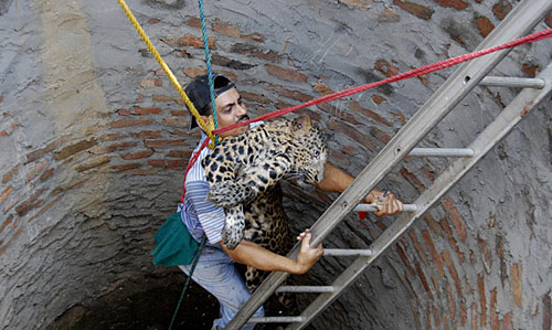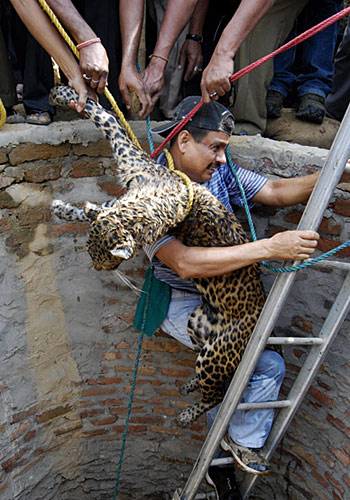 3月28日,在印度东北部阿萨姆邦首府高哈蒂郊区,一名兽医正在营救一只落井的豹子。随后,这只成年母豹被带到高哈蒂动物园。这是该地区在当月营救的第二只豹子。