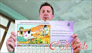 据悉,英军士兵在塔利班据点内一面墙上发现这本月历。与普通的美女、跑车或者风景月历不同,塔利班月历一月份封面人物是基地组织头目拉登和塔利班最高头目奥马尔,他们身边放着钱和武器,手指着被塔利班炸毁的巴米扬大佛。二月份月历封面是一个塔利班坟场。这本月历上不仅有普什图语,而且还有阿拉伯语、波斯语和英语。英军上尉提姆-利云顿称:“我先前从未看到过这样的塔利班宣传材料,尤其是使用非英语文字的。”