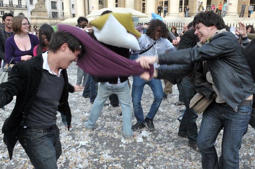 图:法国街头上演“枕头大战”
