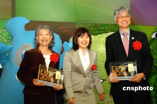 4月11日下午,上海世博组委会在东京举行“魅力上海,精彩世博——2009日本上海世博推荐周”开幕式。上海市常务副市长杨雄和上海世博会日本推广形象大使福原爱共同向“超级世博迷”山田外美代及日本观光厅长官本保芳明赠送了第一张世博门票。日本家庭主妇山田外美代在2005年爱知世博会期间创下了每天入场、总入场数达二百四十三次的纪录,被日本媒体授予“世博全勤奖”。图为福原爱(中)与山田外美代(左)、本保芳明(右)在开幕式上。中新社发 朱沿华 摄