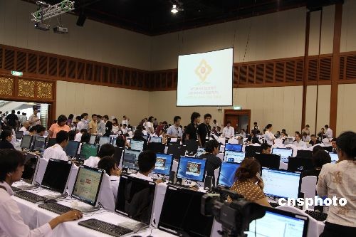 4月11日下午,冲击东亚领导人系列峰会会场的泰国“红衫军”正在撤离帕塔亚返回曼谷,东亚领导人峰会已取消举行。但设在帕塔亚皇家克里夫酒店底层的东亚领导人峰会新闻中心一片繁忙,来自世界各地的媒体记者依然忙碌。中新社发 顾时宏 摄