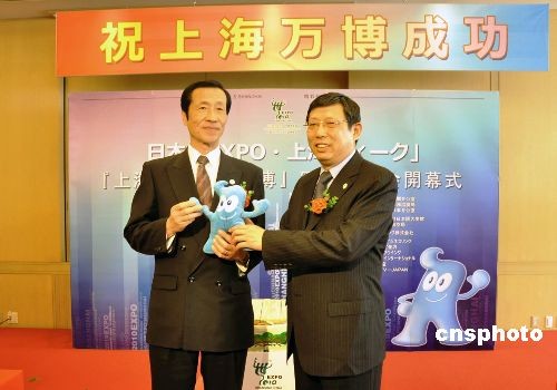 4月13日下午,日本“上海世博推介周”中的重要环节——“上海与上海世博会”图片展,在东京羽田机场开幕。图片展将持续到本月底,计划在羽田机场、京滨急行列车“世博号”以及其他东京地铁列车和站台上展出反映上海城市风情、市民生活、世博筹备等各方面的图片共700幅,以让日本市民直观、生动地了解上海与上海世博会的最新情况。图为上海世博会执委会常务副主任、上海市常务副市长杨雄(右),向东京都副知事菅原秀夫赠送上海世博会吉祥物海宝。中新社发 关妍 摄