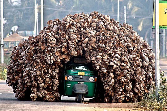 据英国媒体26日报道,近日,在印度Mysore郊区一个椰子商贩在向市区运送椰子,成百上千的椰子几乎将骑着三轮的他淹没,场面令人忍俊不禁。