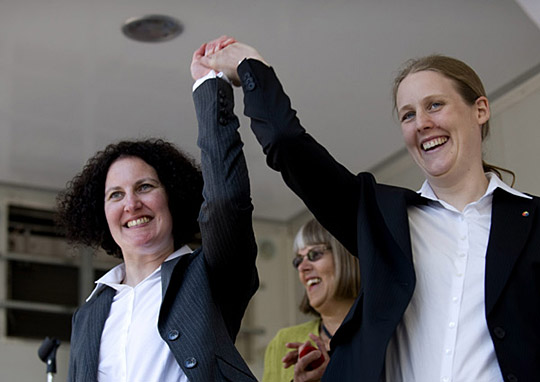 两名瑞典女性在斯德哥尔摩结婚后庆祝。