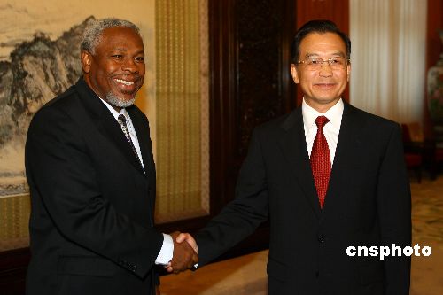 八月二十三日,中国国务院总理温家宝在北京会见来访的格林纳达副总理兼农业部长鲍恩。中新社发 盛佳鹏 摄