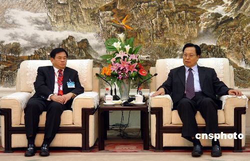 八月二十八日,河南省委书记徐光春(右)会见港澳台代表。河南省首届豫商大会当日在河南郑州开幕,此次盛会由河南省政协主办,海内外多家商业协会积极参与。大会期间将举行乡情联谊、商务考察等众多活动。中新社发 慎重 摄