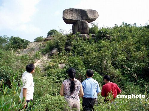 福建省漳浦县赤土乡浯源村水磨自然村的一块天然“蘑菇石”高约五米多,“菇帽”直径约四米多,引得人们对此天然奇石纷纷称奇。中新社发 蓝智伟 摄