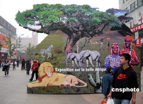 十月二十七日,北京王府井步行街上具有非洲特色的展览板十分醒目。近年来,越来越多的中国游客走出国门,前往非洲旅游。中非合作论坛北京峰会将于十一月初在北京举办。中新社发 杜洋 摄