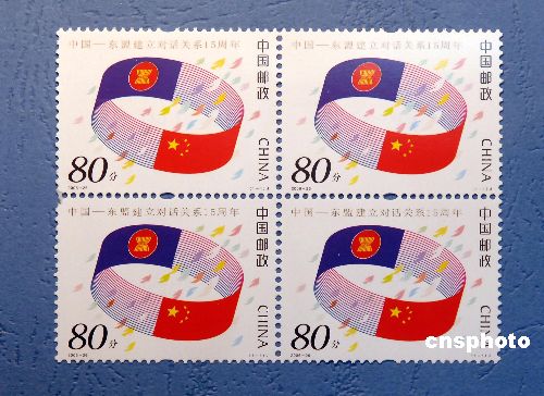 中国国家邮政局定于二○○六年十月三十日发行《中国-东盟建立对话关系15周年》纪念邮票一套一枚,邮票图名是《中国-东盟建立对话关系15周年》,面值为八十分。东盟的全称是东南亚国家联盟,成立于一九六七年八月八日。一九九一年,中国开始与东盟的对话进程。近年来,中国--东盟关系全面快速发展,在诸多领域的交流与合作取得了重要成果。中新社发 邹宪 摄
