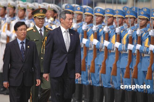十月二十九日中午十二时十八分,新加坡总理李显龙飞抵广西南宁国际机场,李显龙将参加三十日在南宁开幕的中国—东盟建立对话关系十五周年纪念峰会。图为李显龙检阅中国人民解放军三军仪仗队。中新社发 蒋雪林 摄