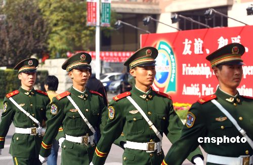 十一月一日,中非合作论坛第五届高官会在北京开幕,来自中国和论坛所有四十八个非洲成员国的代表参加了会议,武警战士在会场外巡逻,确保会议安全进行。中新社发 盛佳鹏 摄