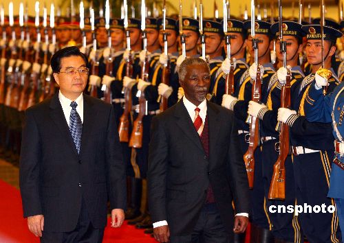 十一月六日,中国国家主席胡锦涛在北京人民大会堂主持会议欢迎南非总统姆贝基。中新社发 廖文静 摄