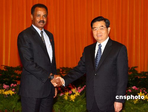 十一月六日,中国国家主席胡锦涛在北京人民大会堂会见厄立特里亚总统伊萨亚斯。中新社发 廖文静 摄