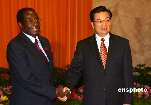 十一月六日,中国国家主席胡锦涛在北京人民大会堂会见津巴布韦总统穆加贝。中新社发 廖文静 摄