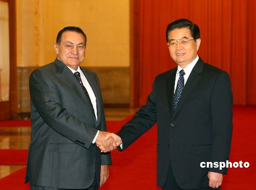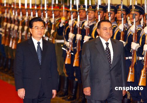 十一月七日,中国国家主席胡锦涛在北京人民大会堂主持仪式,欢迎埃及总统穆巴拉克。中新社发 廖文静 摄