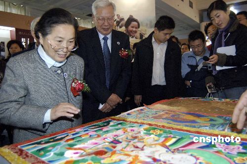 十一月十七日,第一个以人权为主题的大型综合性展览“中国人权展”在北京民族文化宫开幕。全国人大常委会副委员长何鲁丽、全国政协副主席罗豪才出席开幕式并参观展览。在体现国家对少数民族人权进行保障的演示区域,何鲁丽等对藏族唐卡兴趣浓厚。中新社发 徐曦弋 摄