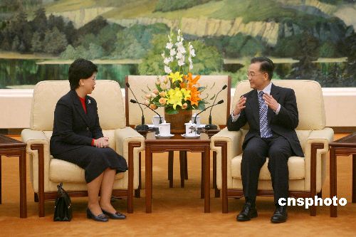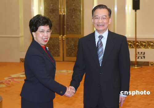 十一月二十八日,中国国务院总理温家宝在北京人民大会堂会见世界卫生组织总干事陈冯富珍。中新社发 盛佳鹏 摄