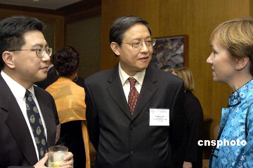 美国中国总商会成立一周年的活动中,中国驻美大使周文重专程前来祝贺并发表讲话,在和美国商界领袖的交谈中,周文重大使高度评价一年来美中商界进行的友好合作。图为当地时间十二月七日,中国驻美大使周文重(中)和美中商界人士交谈。中新社发 邱江波 摄