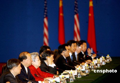 十二月十四日,首次中美战略经济对话在北京人民大会堂开幕。中国国家主席特别代表、国务院副总理吴仪和美国总统特别代表、财政部长保尔森共同主持此次对话会。中新社发 盛佳鹏 摄