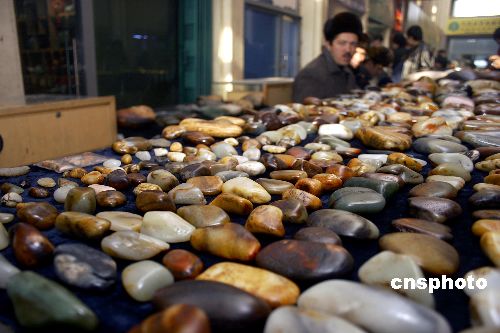 十二月十四日,位于新疆乌鲁木齐市山西巷附近的新疆民街和田玉市场人头攒动,各种和田玉籽料堆满摊档。目前该市涉及经营玉器、玉石、首饰的企业有一千三百五十九家。业内人士表示,二00六年新疆和田玉从上世纪八十年代末的每公斤几十元人民币一路飙升,至今已到几万元,籽料则在每公斤几万元到十几万元之间,上等籽料每公斤已达几十万元至一百万元以上。乌鲁木齐已成为中国和田玉市场的一大集散地,亦是重要的原料加工基地。中新社发 刘新 摄