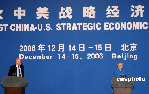 十二月十五日,首次中美战略经济对话在北京人民大会堂闭幕,中国国务院副总理吴仪和美国财政部长保尔森会后共同会见记者。中新社发 盛佳鹏 摄