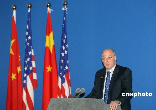 十二月十五日,首次中美战略经济对话在北京人民大会堂闭幕,中国国务院副总理吴仪与美国财政部长保尔森会后共同会见记者。中美一致认为,这次对话是成功的。图为美国财政部长保尔森发表讲话。中新社发 盛佳鹏 摄