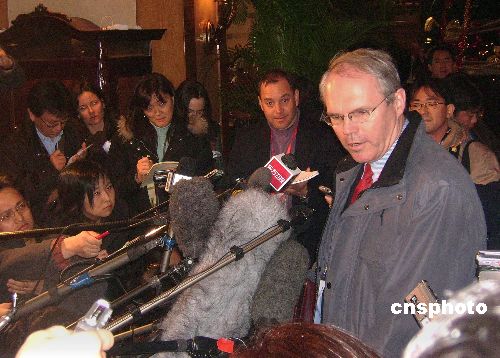 十二月十八日晚,朝鲜半岛核问题六方会谈美国代表团团长、助理国务卿希尔,在结束当天的会议后回到下榻的北京国际俱乐部时接受各国媒体的采访,并对会议情况进行简短回答。当天,中断了十三个月的朝鲜半岛核问题六方会谈在北京重新启动。中新社发 杜洋 摄
