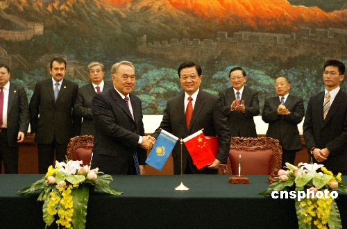 十二月二十日,北京人民大会堂,中国国家主席胡锦涛与哈萨克斯坦总统纳扎尔巴耶夫,共同出席《中哈二十一世纪合作战略》等文件的签字仪式。中新社发 任海霞 摄