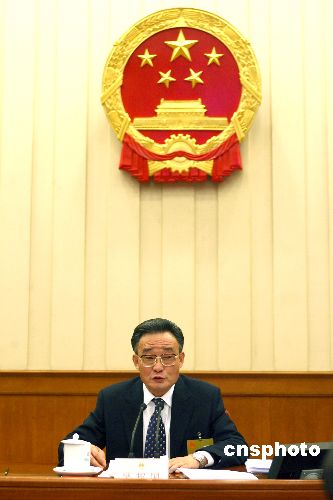 十二月二十九日,十届全国人大常委会第二十五次会议在北京闭幕。全国人大常委会委员长吴邦国主持会议。中新社发 廖文静 摄