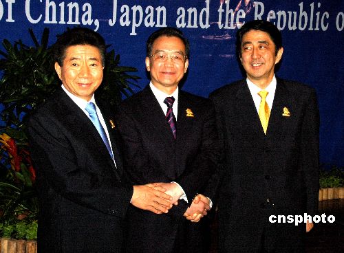 1月14日,第七次中国、日本、韩国领导人会议在菲律宾宿务举行。中国国务院总理温家宝、日本首相安倍晋三和韩国总统卢武铉出席会议。温家宝主持会议。 中新社发 王岩 摄