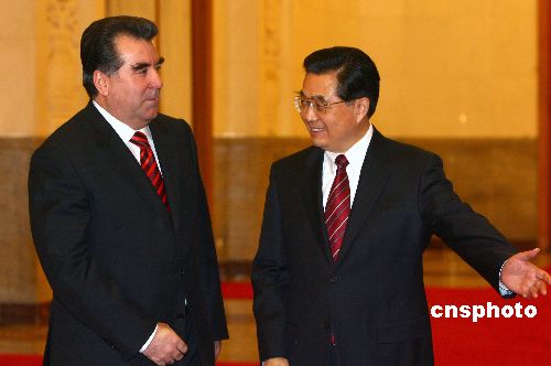 一月十五日,中国国家主席胡锦涛在北京人民大会堂举行欢迎仪式,欢迎塔吉克斯坦共和国总统埃莫马利·拉赫莫诺夫。中新社发 廖文静 摄