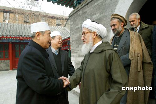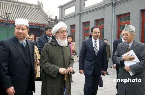 应全国政协主席贾庆林邀请,阿富汗议会长老院主席西卜加图拉·穆贾迪迪一行十人近日对中国进行友好访问。一月十九日,穆贾迪迪一行在北京参观东四清真寺并在该寺参加主麻日活动。中新社发 张勤 摄