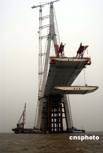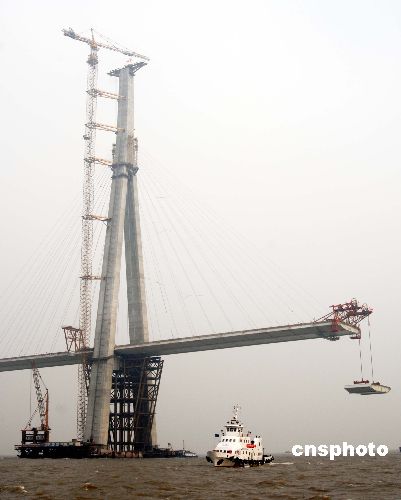 为配合世界第一斜拉桥——苏通长江大桥的主跨钢箱梁吊装,确保吊装期间桥位上下游各2.5公里水域内无其他船舶通行,保证施工和航行安全,1月26日,经国家海事局批准,江苏海事部门在上海海事局、浙江海事局、长江海事局、江苏省地方海事局等单位的密切配合下,在长江苏通大桥施工水域实施了双向禁航的大规模交通管制,这是长江有史以来最大规模的交通管制。中新社发 陈红飞 摄