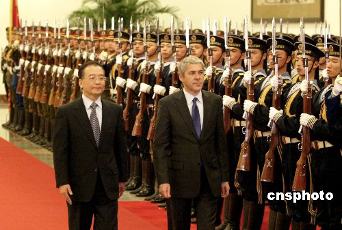 一月三十一日,中国国务院总理温家宝在北京人民大会堂举行仪式欢迎葡萄牙总理若泽.苏格拉底访华。中新社发 任海霞 摄