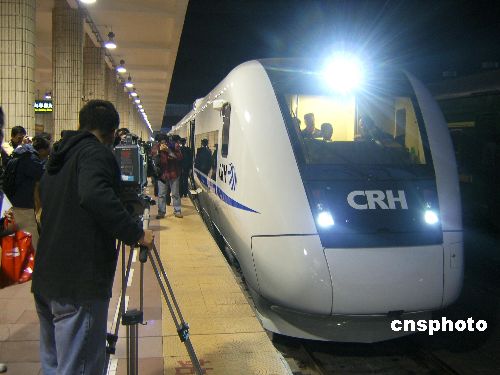 二月一日,中国铁路高速CRH正式在广深线投入运行,清晨六点四十五分和七点零五分,载有111名旅客的T971次和载有261名旅客的T980次列车分别从广州和深圳两地开出。中新社发 郭军 摄